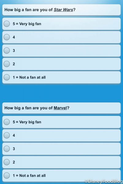 Perhaps the most surprising question of this survey asked us to rank how BIG of a fan we are of Star Wars and Marvel. Huh…neither of these franchises are even in Animal Kingdom! It’s likely that Disney is just looking to gauge interest from their guests overall.