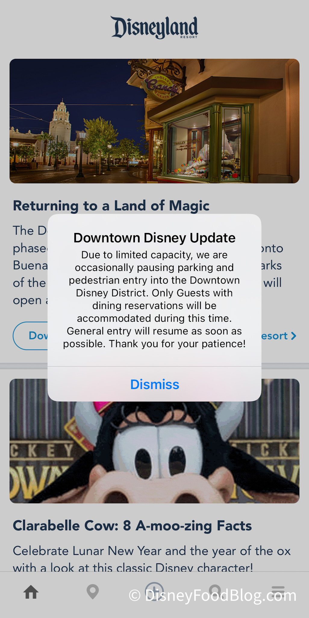 When we checked out the Disneyland app, we received a pop-up notification informing us that “due to limited capacity,” they are “occasionally pausing parking” as well as pedestrian entry into the shopping and dining district. At this time, only guests with confirmed dining reservations will be allowed to enter.