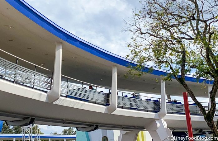 As we walked around Magic Kingdom today, we saw that the PeopleMover was being tested (something we’ve seen before). BUT, this time was different! This time, the PeopleMover was actually MOVING REAL PEOPLE! It’s a bit difficult to see in the photo below, but we saw one individual sitting in the front of the ride and another sitting near the back.