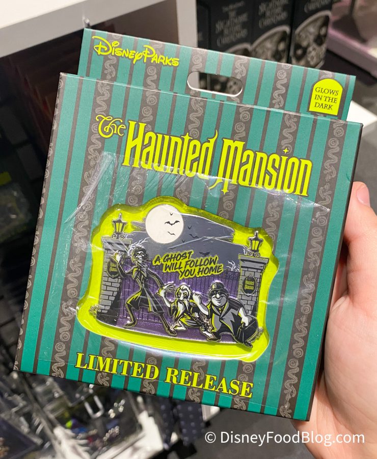 We also found an assortment of new pins at the Backlot Premiere Shop. We found a new Haunted Mansion jumbo pin that glows in the dark for $29.99.