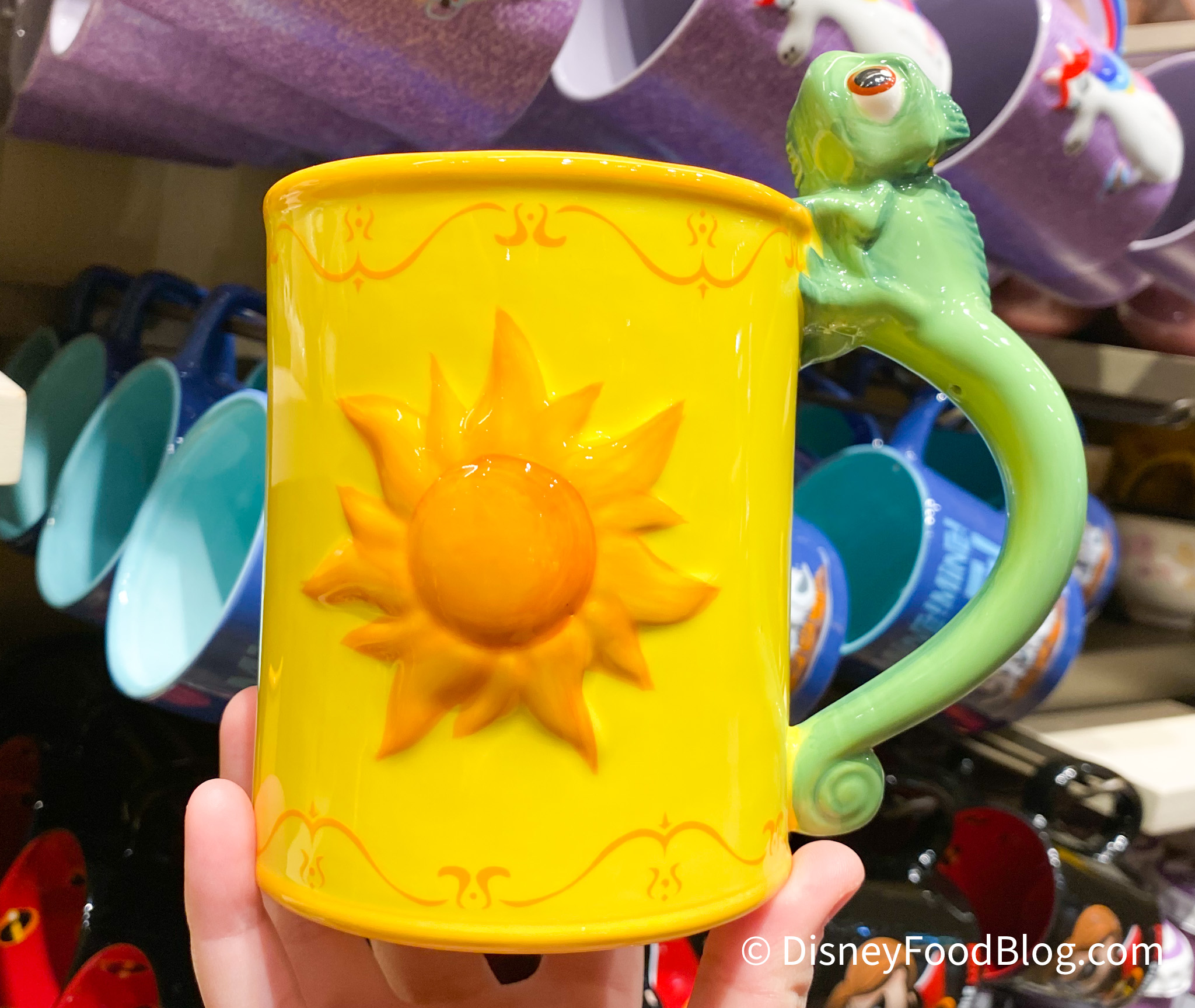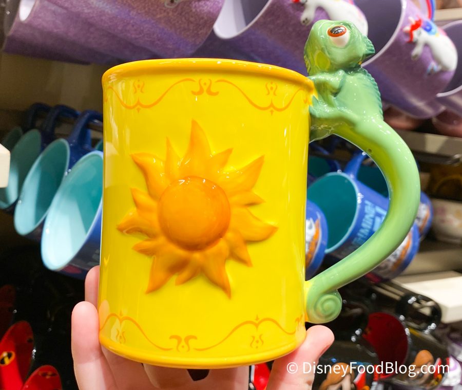 We spotted a couple of new mugs on our recent visit to Downtown! The first is this adorable Tangled mug, with Pascal sitting on top — his tail is the handle!