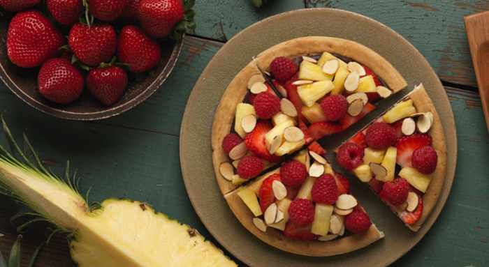- SPRINKLE almonds over fruit if desired, cut the pizza into four equal portions and serve while chocolate is still warm.