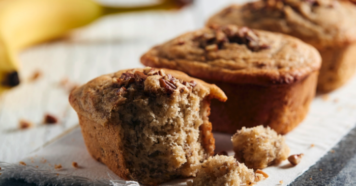 - WHISK flour, sugar, baking powder, baking soda and salt in a medium bowl. Whisk eggs in a large bowl; stir in bananas, yogurt, buttery spread and vanilla extract. Add flour mixture and stir just until combined; pour into prepared pan and sprinkle with pecans. Bake bread 1 hour 5 minutes or until toothpick inserted in center comes out with a few crumbs and top is golden brown.