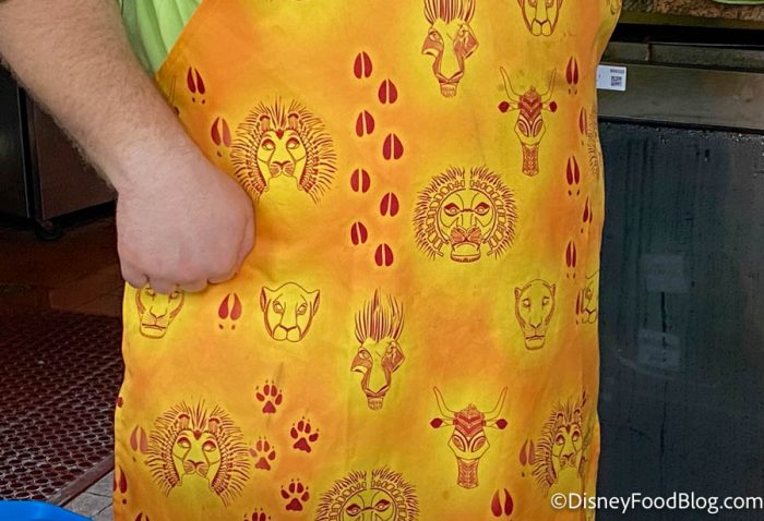Over at the Maji Pool Bar, Cast Members added a new piece to their ensemble — an apron! And, it’s not any average apron. It’s got animals crawling all over it. The colors are reminiscent of the African sunset with warm orange and yellow colors.