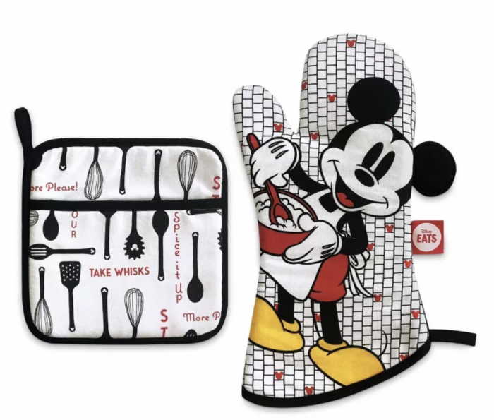 You’re almost done cooking an entire meal with Mickey kitchen items. Now to put whatever you’re making in the oven or heat it up on the stove. The Mickey Oven Mit and Pot Holder Set feature Mickey whipping up his own meal and little hidden Mickeys and witty quotes on the potholder.