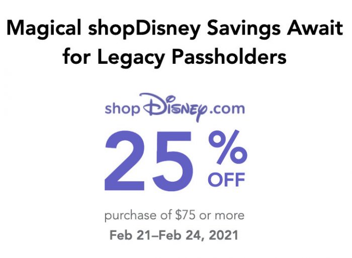 One of those perks has arrived in the form of a recent email to all Legacy Passholders: they can now save 25% off purchases of $75 or more on shopDisney. This offer is available from February 21st through February 24th.