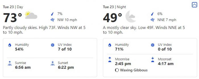 Here, we’re looking at an 84-degree high and a 66-degree low.
