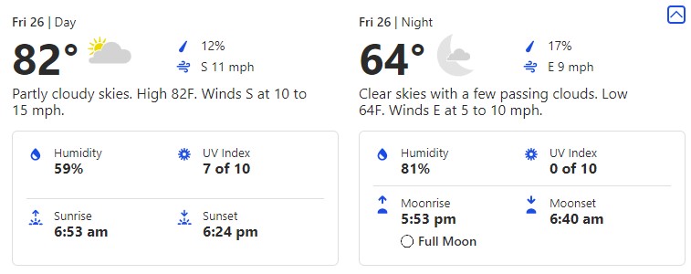 For Thursday, February 25th, we’re seeing a warmer day in the low-80s and a similar drop in the evening to the low 60s.