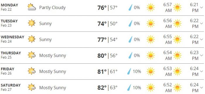 The next day, February 23rd, brings us slightly cooler temps hitting 73 degrees during the day and dropping that low down to a chilly 49 degrees.