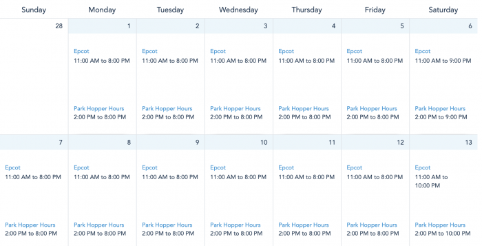 Over at EPCOT, the previously posted park hours of 11AM-8PM are being extended by one hour in the evening on Saturday, March 6th to 11AM-9PM. In addition, on March 13th EPCOT will remain open for an additional two hours in the evening, with posted hours of 11AM-10PM.