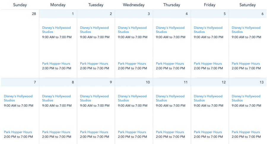 At Hollywood Studios, the park hours are once again extended slightly in the morning. Previously open from 10AM-7PM the week of March 7th, Hollywood Studios will now be open daily from 9AM-7PM from March 1st through March 13th.