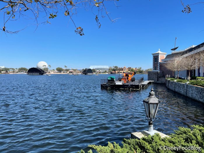 It’s without question that EPCOT’s upcoming nighttime spectacular, Harmonious, is one of our most anticipated attractions in Disney World, which is why we get SUPER psyched any time we see new construction afloat. And continuing this pattern of eager fandom, we spotted another construction barge on World Showcase Lagoon today!
