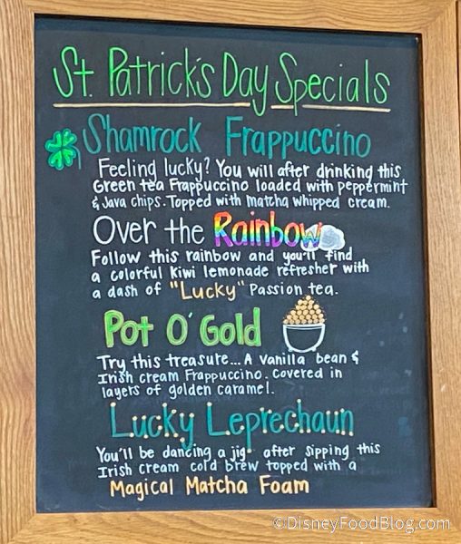 So we hopped over to the Starbucks at Disney Springs West Side and saw some new St. Patrick’s Day drinks! We decided to embrace our inner leprechaun and choose one for our morning pick-me-up!