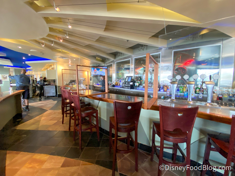 Guests can choose to dine indoors where bar seating is available, with chairs spread out and plexiglass dividing seating areas.