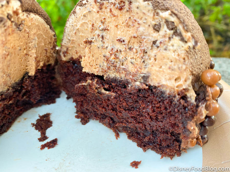 We found the new Baby Tuk Tuk Mousse at Isle of Java at Disney’s Animal Kingdom! This little guy is a five-spice mousse atop a chocolate cake, with a chocolate velvet shell, and crispy chocolate pearls. That’s a LOT of chocolate! There’s also an animated Tuk Tuk face on the front.