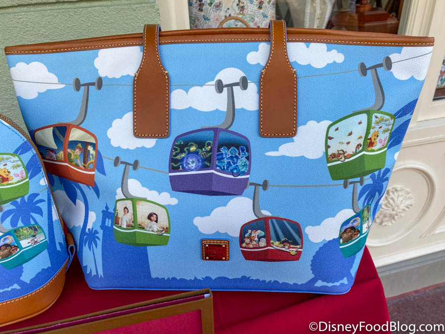 After we’ve already seen one Skyliner bag collection, we were thrilled to find yet another in the parks! This series, though, is very different from the last with more gondolas coasting through the sky with the silhouettes of park attractions and icons in the background. And, it finally has made its official debut in Disney World today!