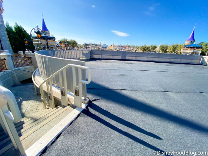 Construction on the Cinderella Castle stage continues. We originally saw some bushes hiding scrim on the railings. Now, the scrim remains, but we’ve also got a new floor covering.