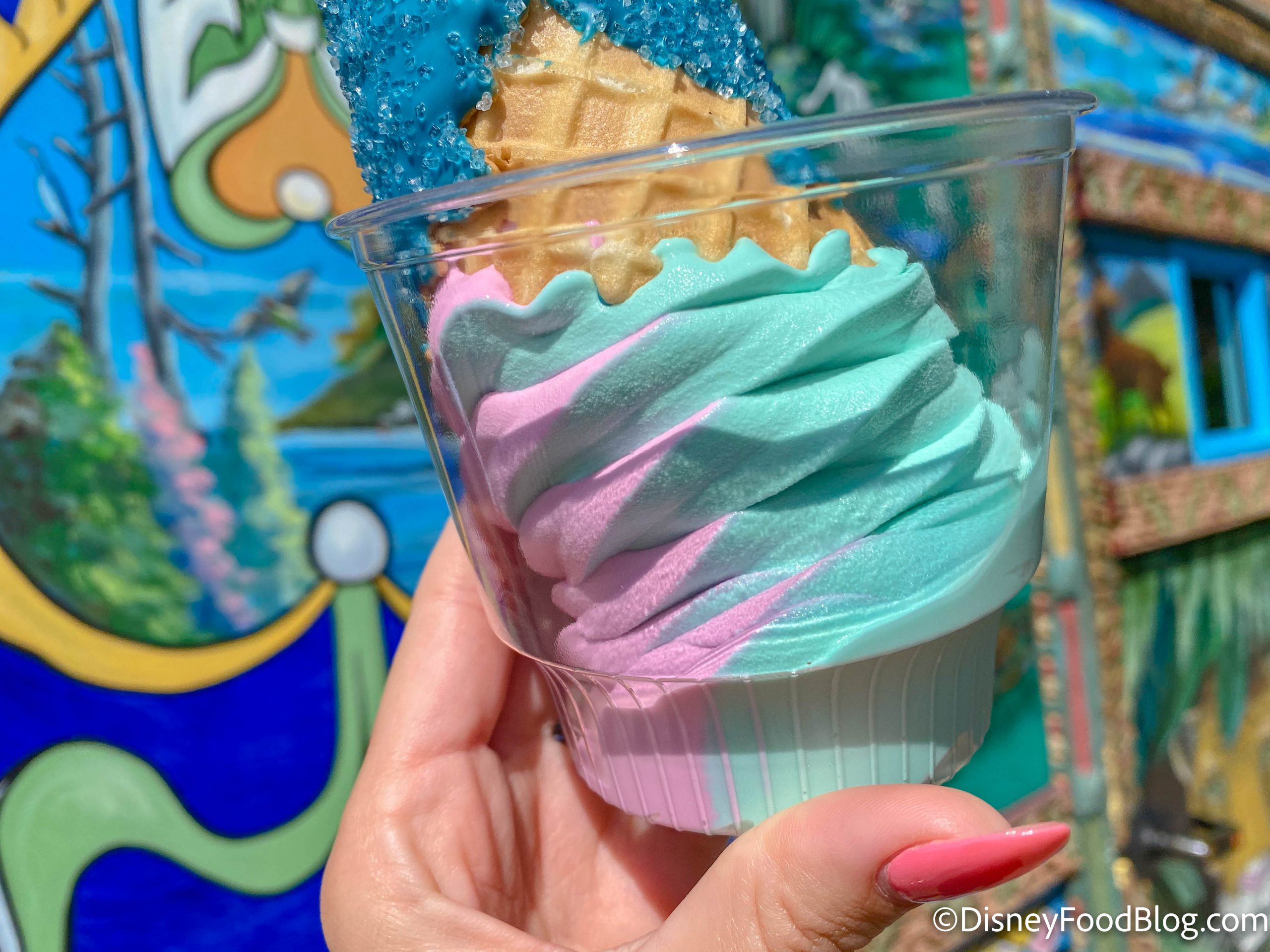 Say hello to the Mighty Mist Soft-Serve Ice Cream! It’s made with strawberry and vanilla ice cream swirled together in a cone. The cone is dipped in blue-colored white chocolate and rolled in sparkling sugar to give it a more “magical” look.