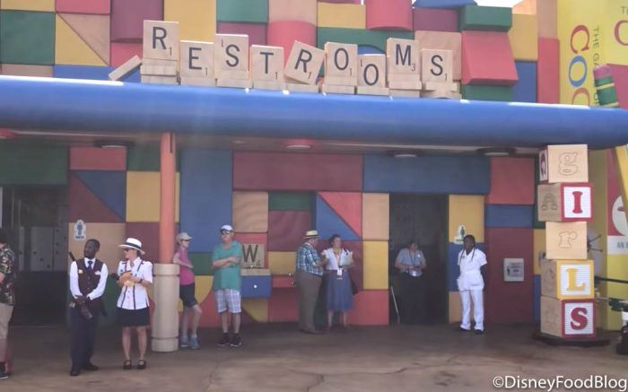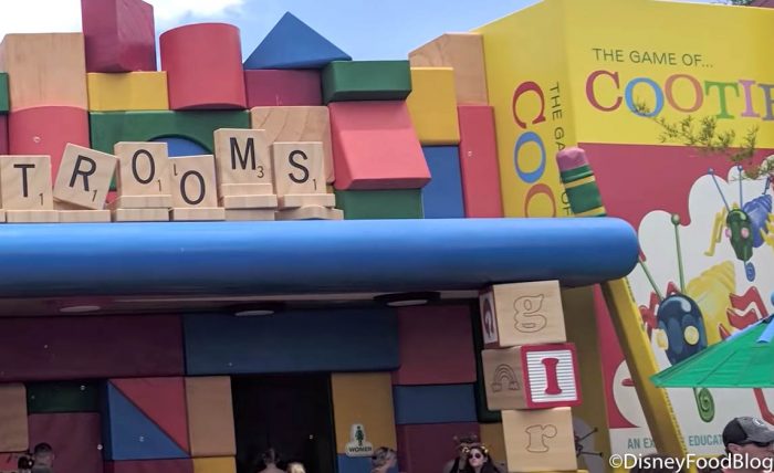 Okay, we could include SO many unique details in Disney’s bathrooms (we even have a list of all the BEST bathrooms in Disney World), but for this one we’ll focus on the restrooms in Toy Story Land in Disney’s Hollywood Studios. All of Toy Story Land is full of incredible details, and the bathrooms are no exception. Notice what the restroom sign is made of? Scrabble pieces! And the “girls” sign — that’s made of kids’ blocks! You’ll also notice the outside walls of the bathrooms are made up of a bunch of building blocks of different shapes and sizes, and more.