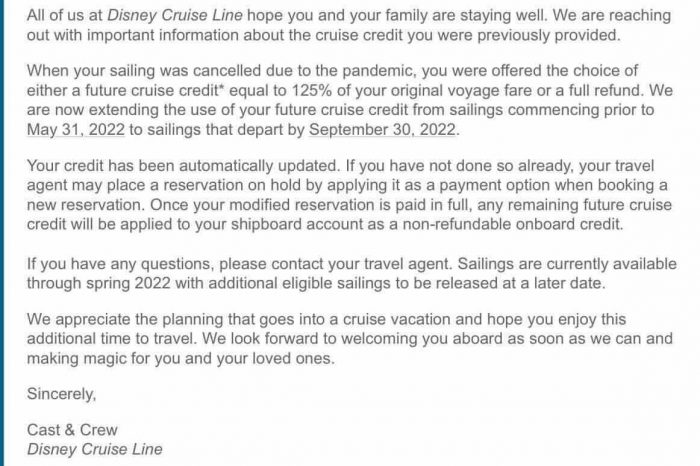Those who opted to receive a future cruise credit received an email from the Disney Cruise Line this morning informing them that they will now be able to book a sailing that departs by September 30th, 2022. And we’re able to show it to you thanks to one of our incredible readers! This extension adds an extra four months to the previous May 21, 2022 extension.