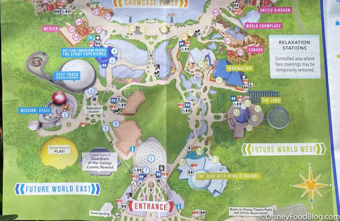 The Future World section of the Map still uses the old names for the areas (a.k.a. Future World West and Future World East) and not the neighborhood terms that will eventually be used as part of the EPCOT Transformation. The map does show some upcoming attractions though like the future spots of the PLAY! Pavilion and Guardians of the Galaxy: Cosmic Rewind.