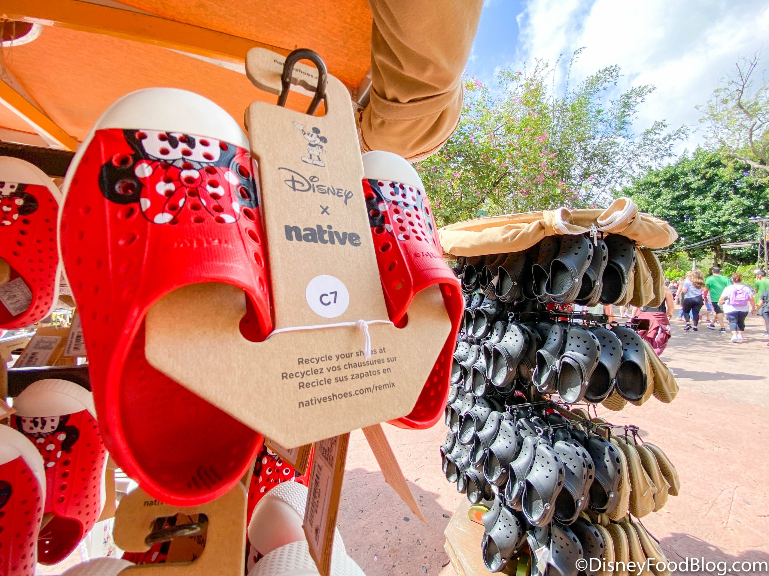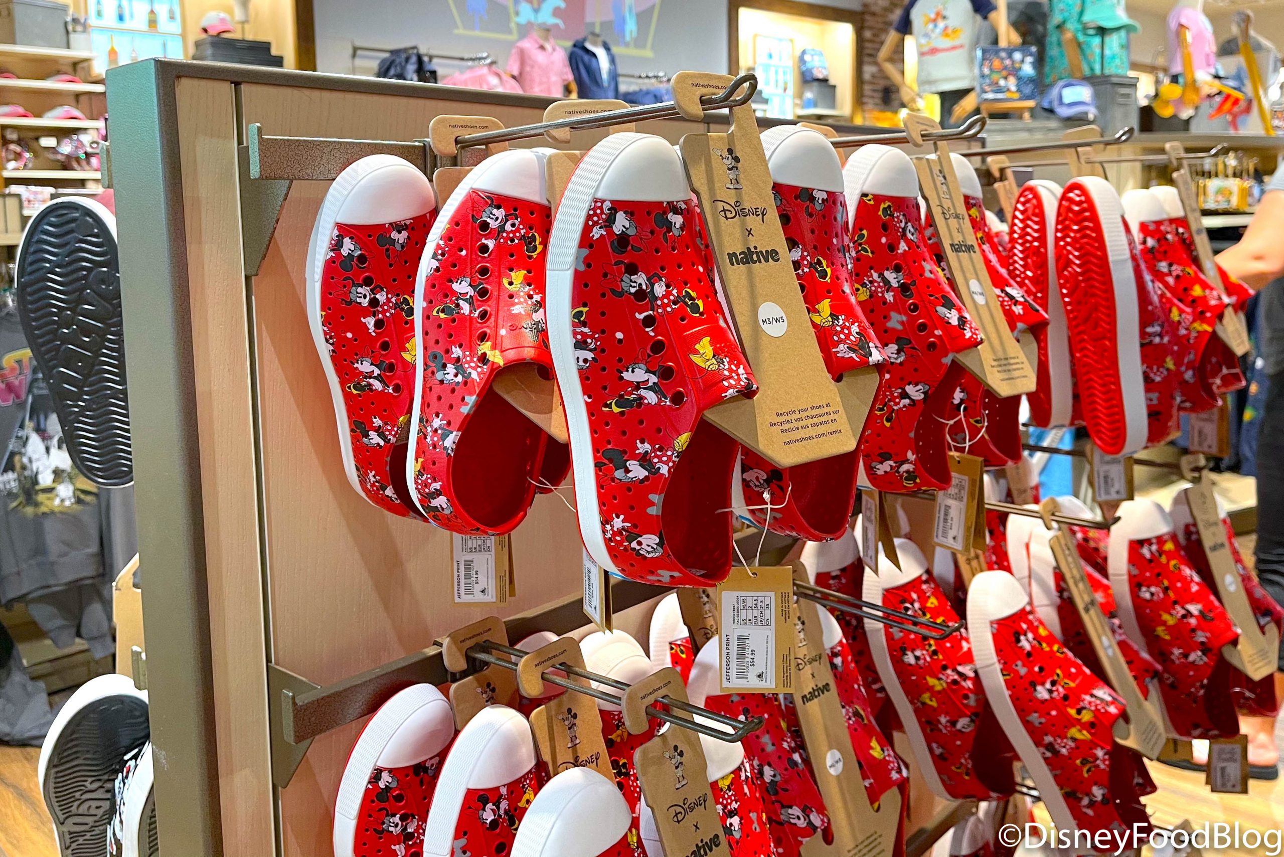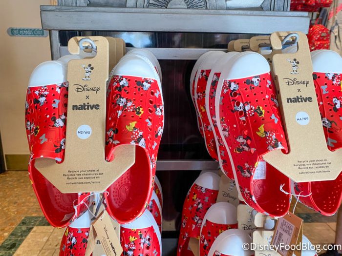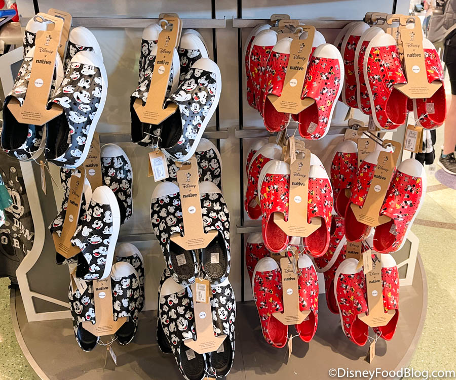 Disney native shoes Minnie and Mickey love them to much money for myself it would be good instead of flip flop . Ever thing at Disney is $ 50.00 or more to pay there is less cost but I would not be interested . I buy shirts that is good quality in the parks I have shirts that still look great . Disney has to realize that there merch is to expensive for a lot of us .