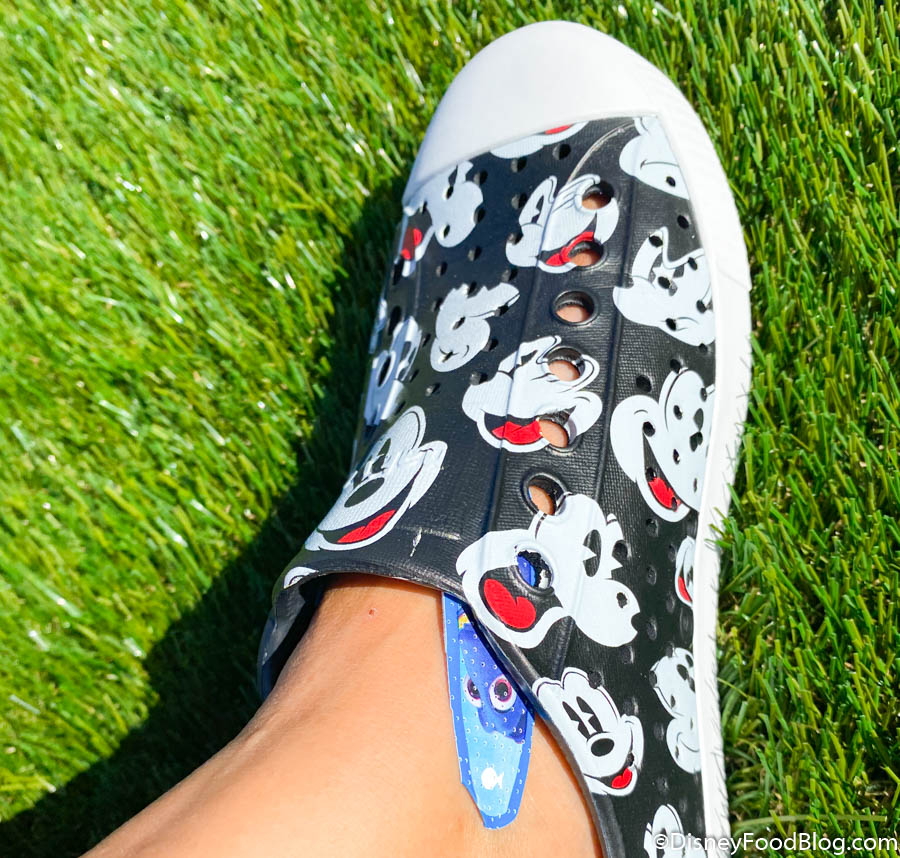 She started to get a small blister on the front of her foot partway into the first day, so she tried covering it with a Band-Aid. It wasn’t the most effective solution, but on day two, she started things off with some waterproof bandages, and that worked much better! We somewhat expected this going in, and this just goes to show why we don’t recommend breaking in new shoes at Disney World.