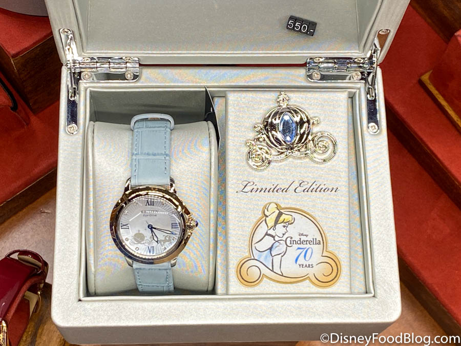 We had to take a break from all the investigation work to do some shopping and we spotted something that Cinderella really could have used at the ball — a watch! The Cinderella Watch and Pin Set is out in celebration of 70 years of watching the princess run down the stairs without her glass slipper. While the set’s not new, we had to share it because it’s so stunning.