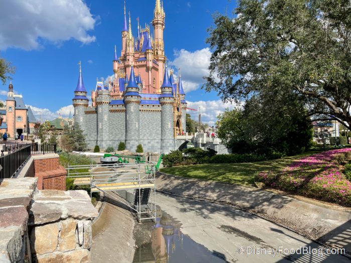 We previously reported that the moat around Cinderella Castle has been drained. And now we’re starting to see some construction around it.