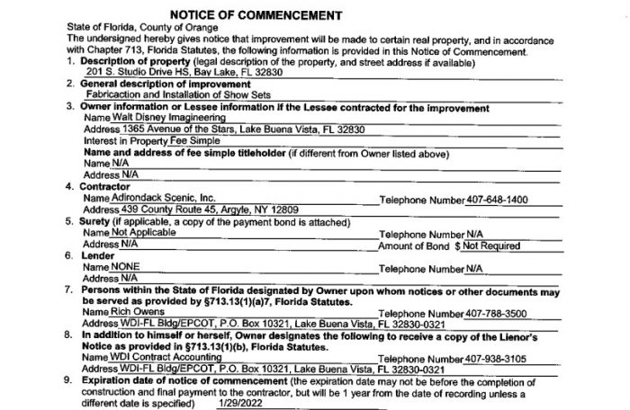 Currently, the expiration date for the permit is listed as January 29th, 2022 which is the date that this construction must be completed and all payments made to the contractor. This is interesting because the hotel is still listed as opening in 2021. Of course, we’re not sure, but typically set installation is COMPLETE before an attraction or experience is debuted. We will keep you all posted as more information is shared.
