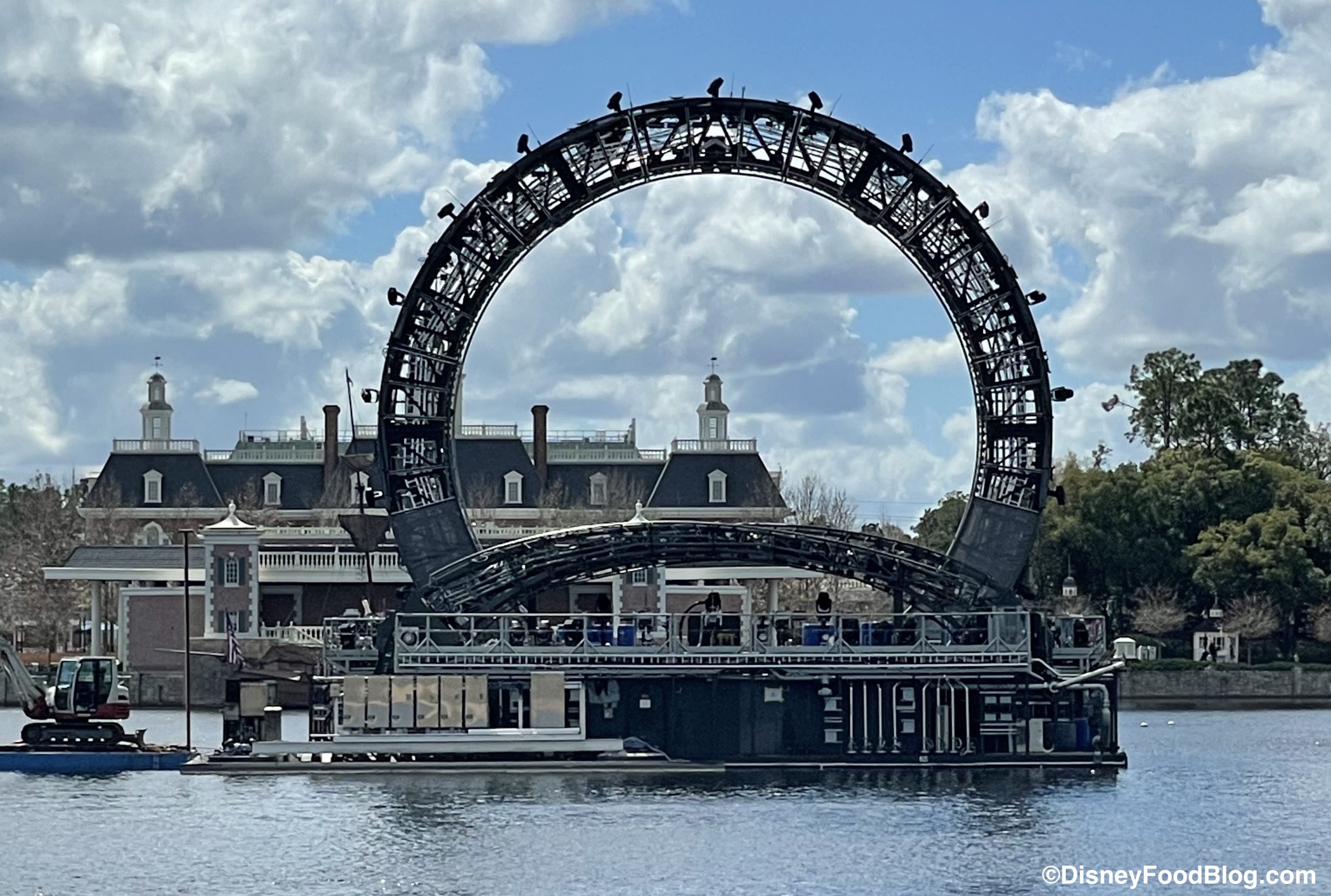 The centerpiece structure is taller than the other barges that have already appeared on World Showcase Lagoon. In fact, we could spot it from a distance as we were approaching the World Showcase.