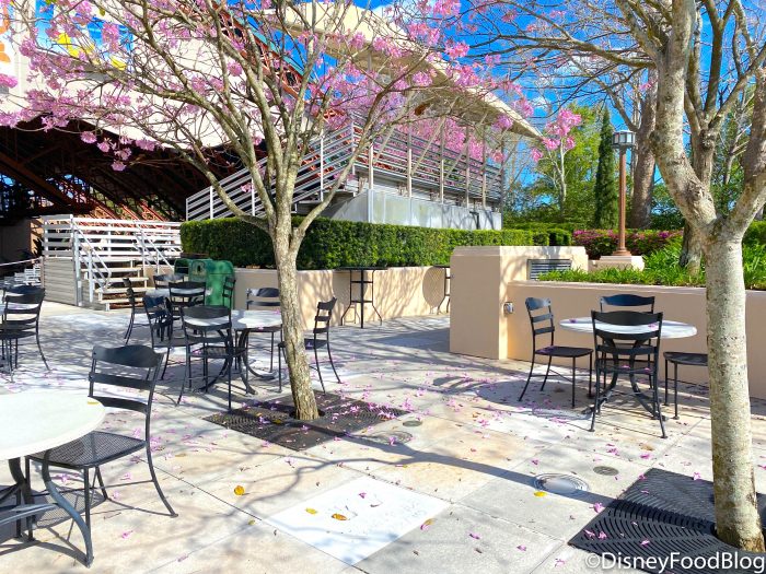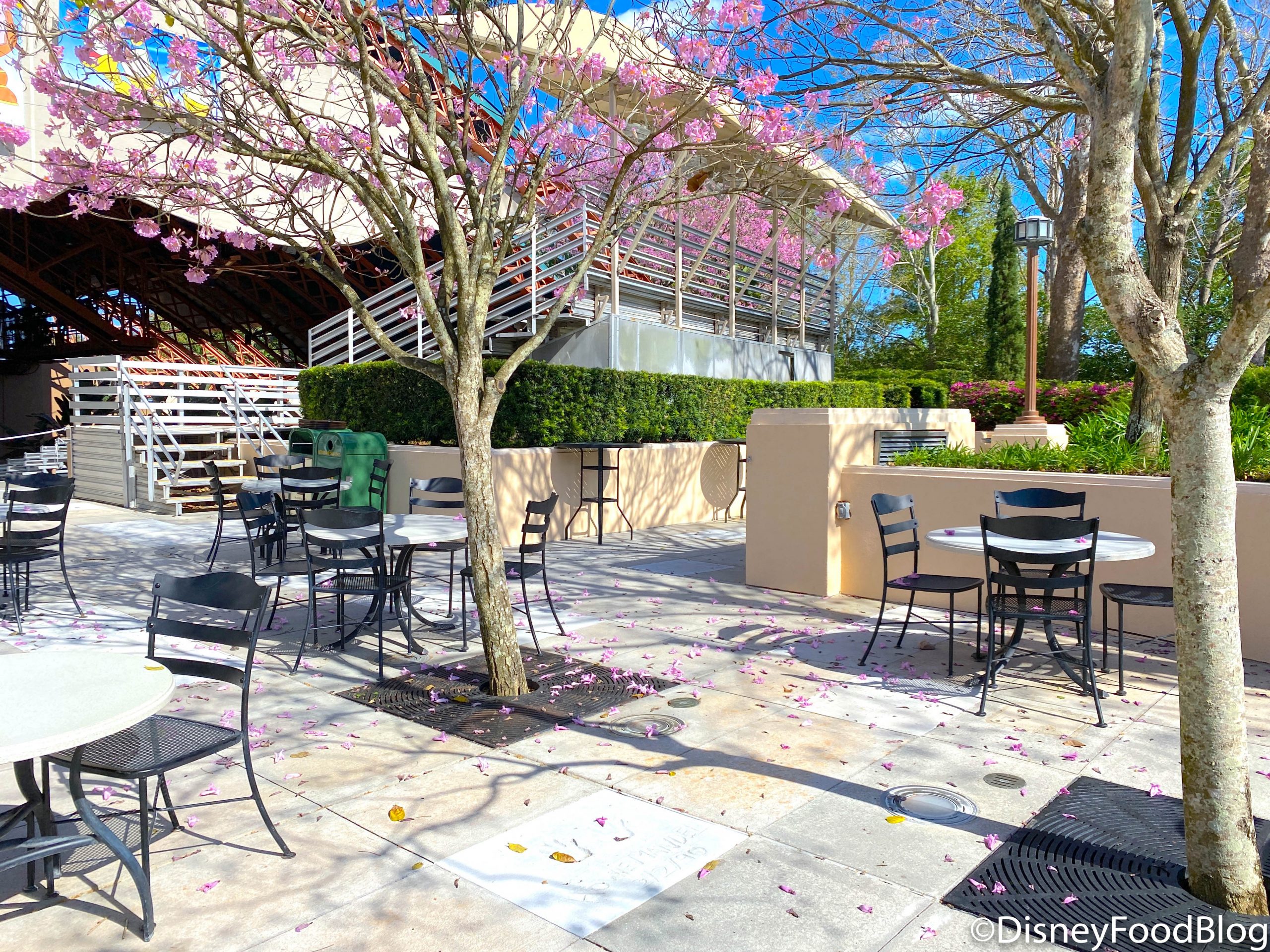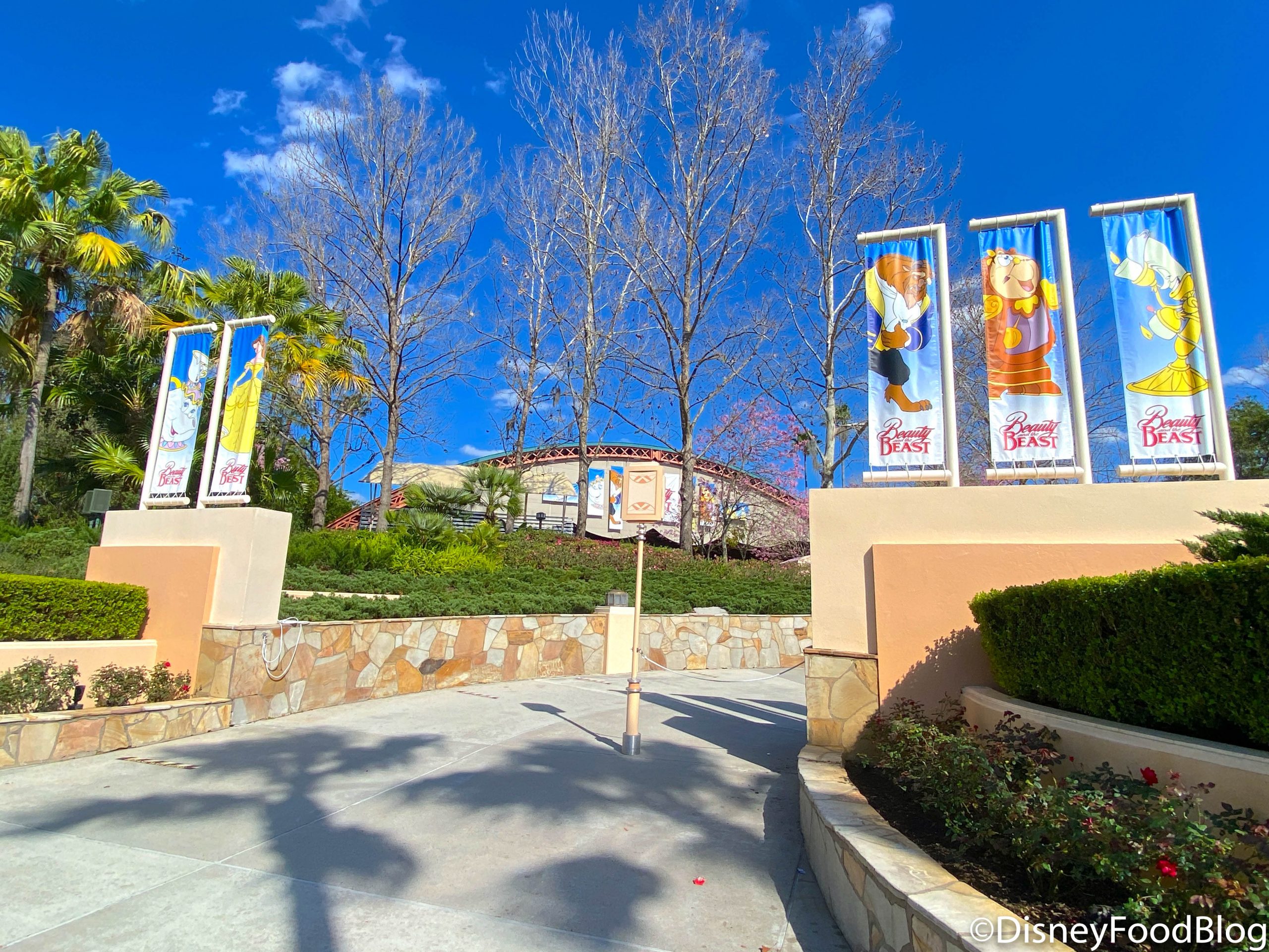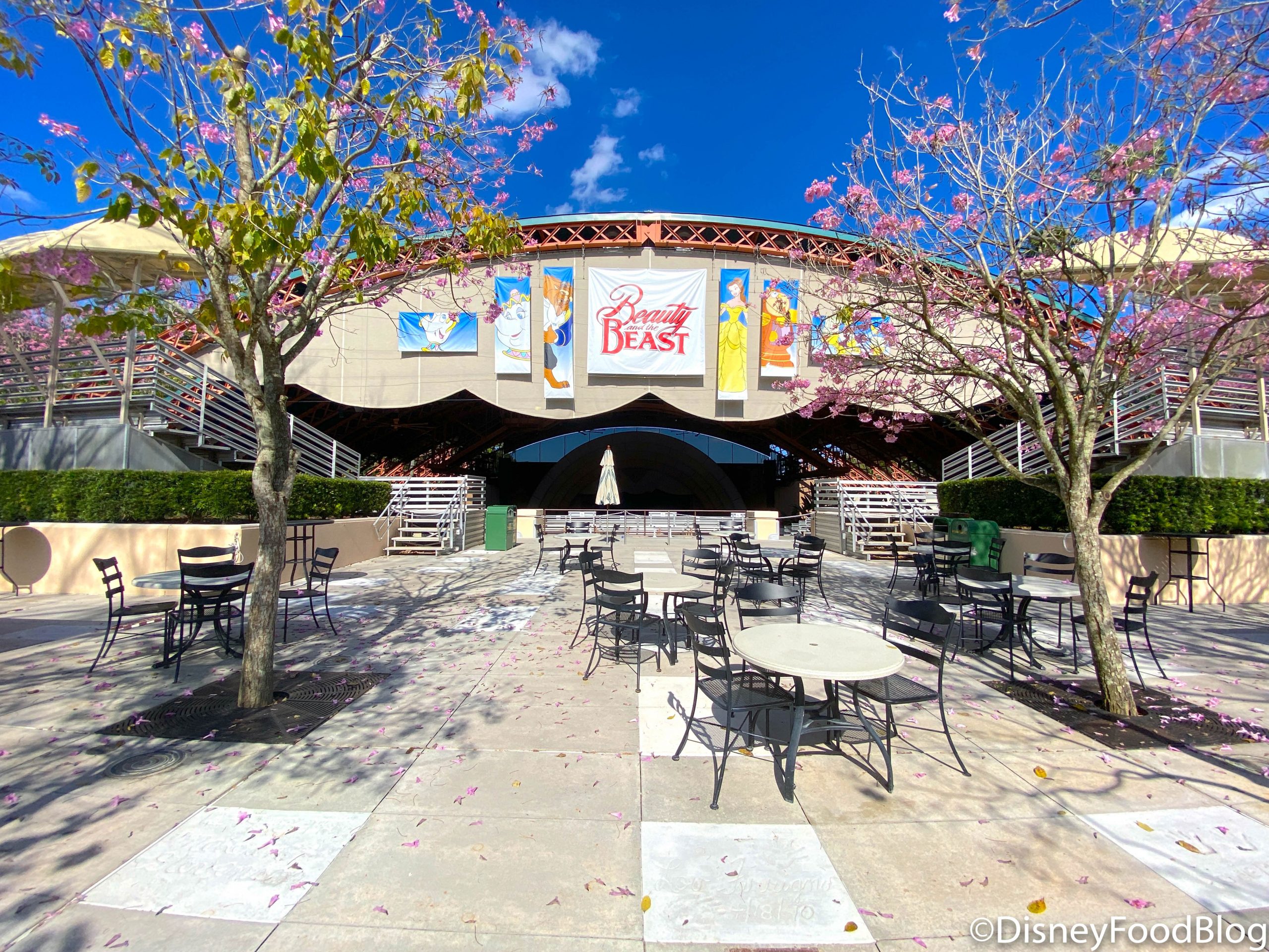 Seating can be a pretty difficult thing to find in Disney World, especially during the peak hours of the day. During our visit, though, we noticed that the Beauty and the Beast stage area was open with extra tables for guests to enjoy their meals.