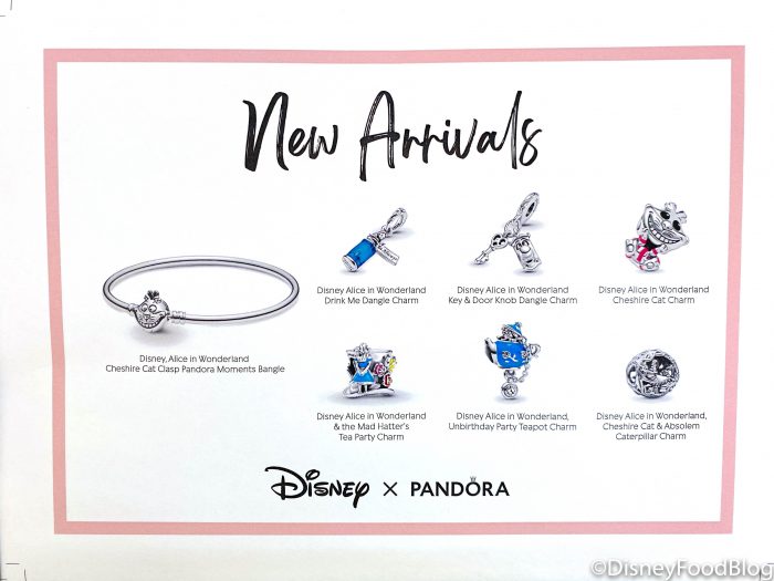 Guests can pick up the Drink Me Dangle charm for $65, Mad Hatter’s Tea Party charm for $65, Key and Knob Dangle charm for $60, Unbirthday Party Teapot charm for $75, Cheshire Cat charm for $55, Cheshire Cat and Absolem Caterpillar charm for $45, and Cheshire Cat Clasp Pandora Moments Bangle for $75.