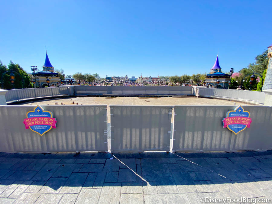New regal-looking signs surround the castle stage, asking guests to, “please pardon the pixie dust.”