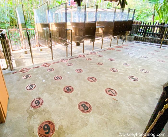 In previous months, the loading zone at Kilimanjaro Safaris was a bit…chaotic. Without very clear floor markers, Cast Members had to point towards specific rows and try to keep the crowds as organized as possible.