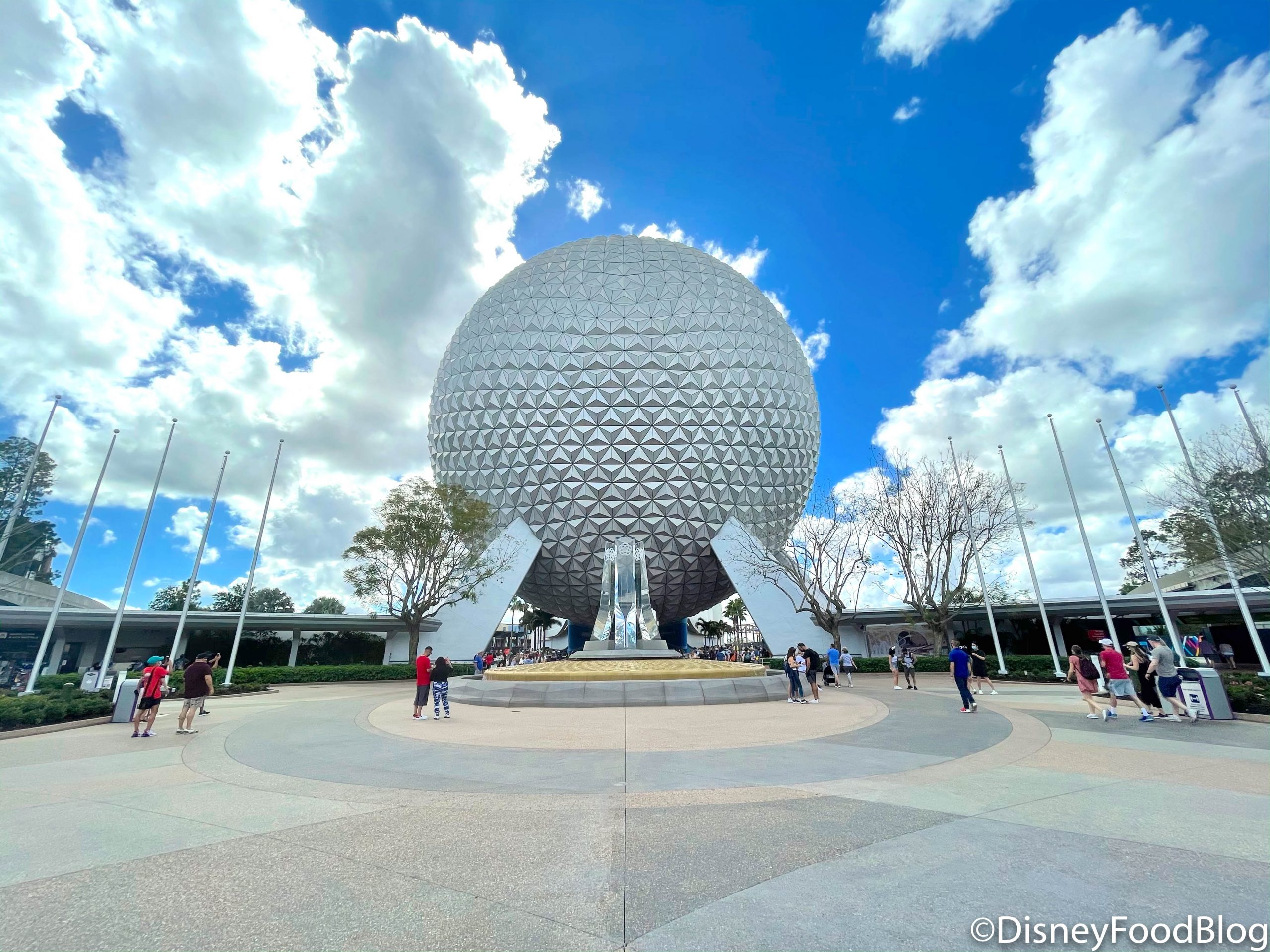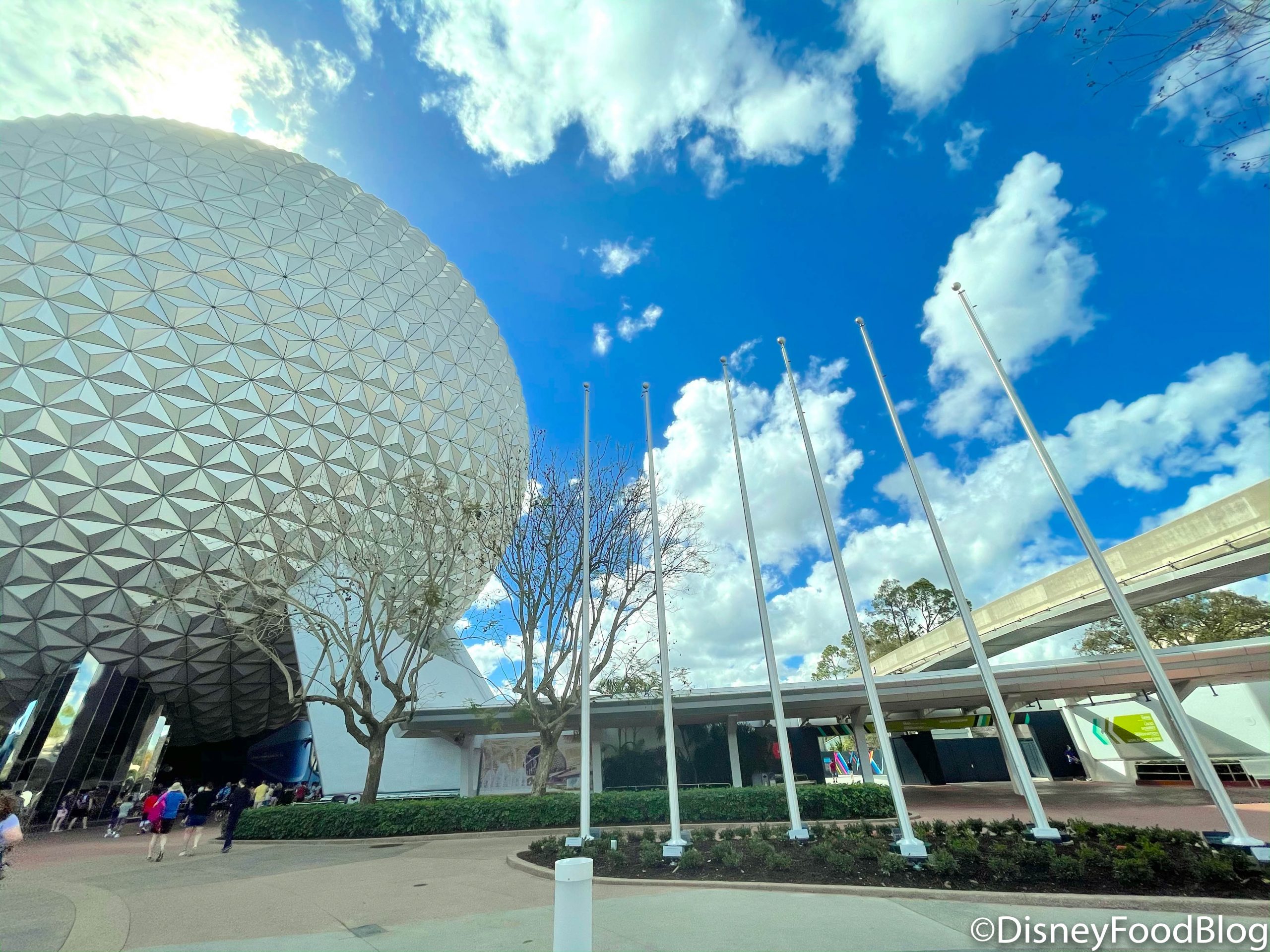 Previously, the flagpoles in front of Spaceship Earth were only on the left-hand side of the attraction. Now, though, you can find them installed on the right side as well!