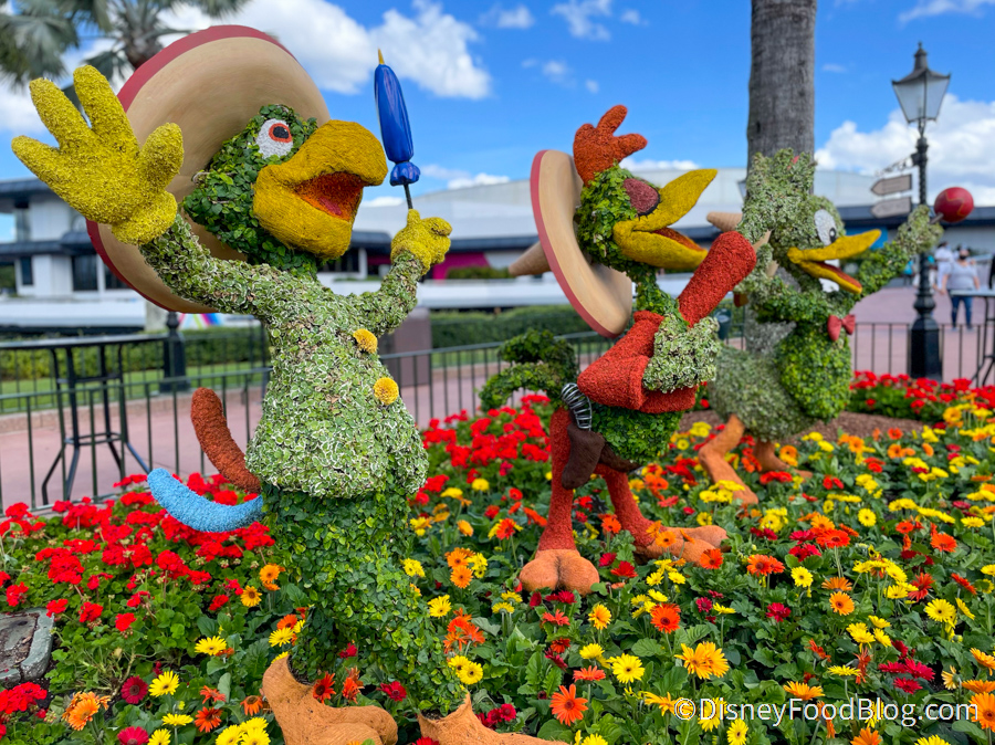 There have been plenty of topiaries practically popping up overnight in EPCOT for the festival as well (some more creepy than cute). And, we couldn’t help but stop and admire the Three Caballeros Topiaries singing their little plant hearts out!