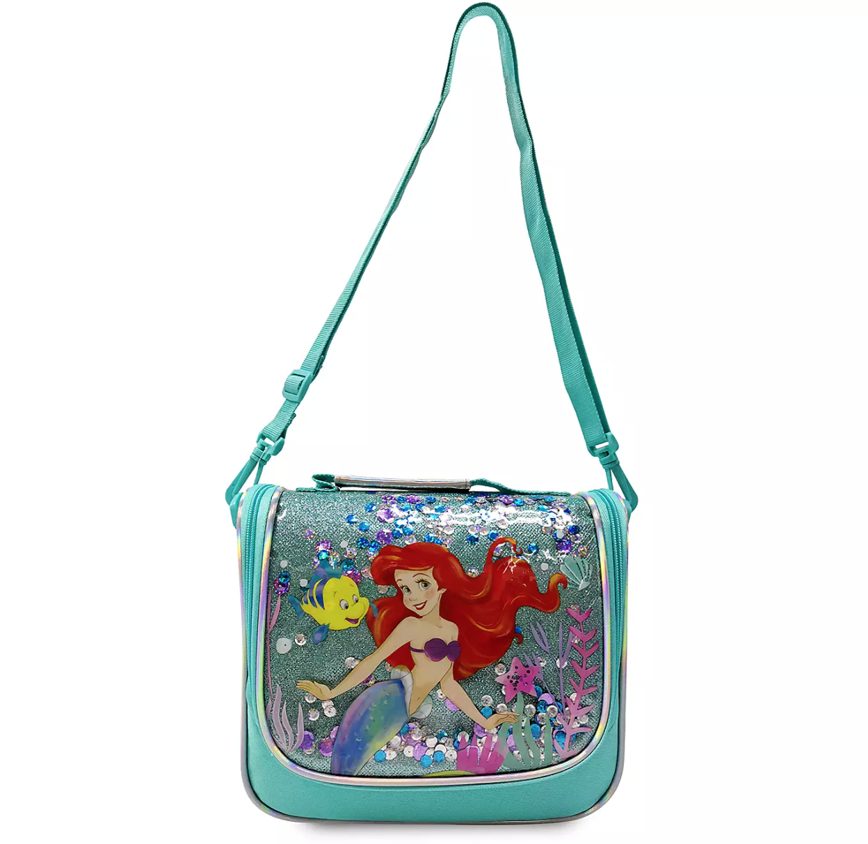 For lunch box/tote options, you can pick up this vibrant Ariel Lunch Box featuring the little mermaid herself and her sidekick Flounder. It even has a shoulder strap for easier carrying!