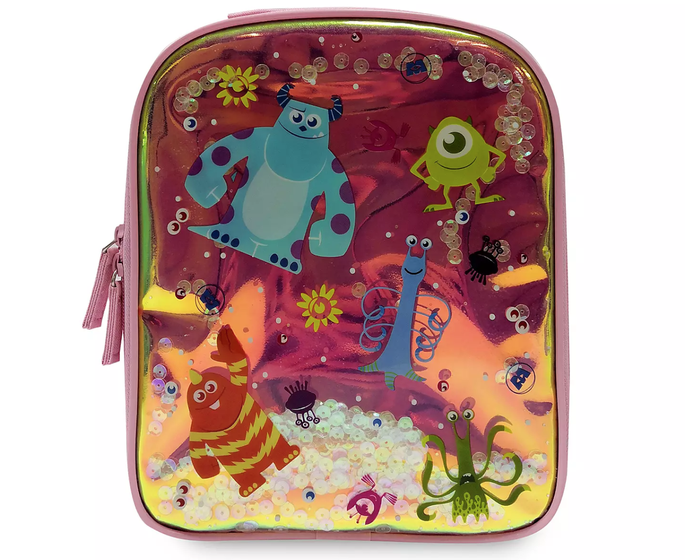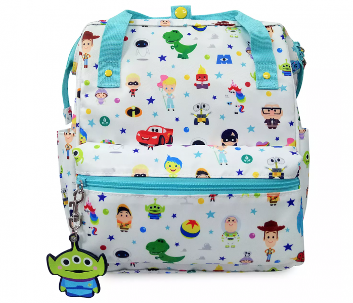 It’s covered in fan-favorite Pixar characters and comes with a little green alien zipper charm.