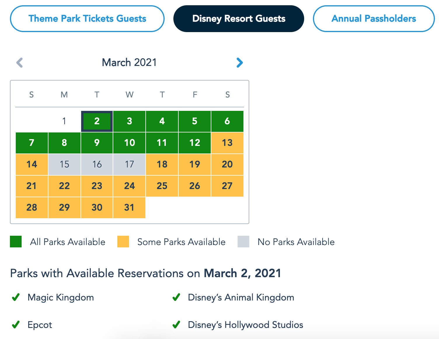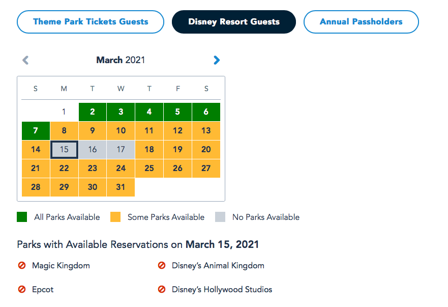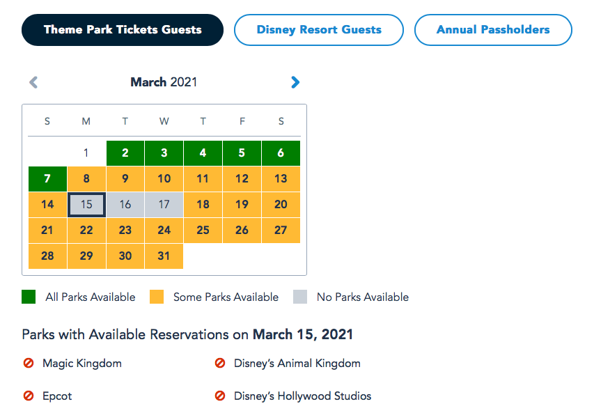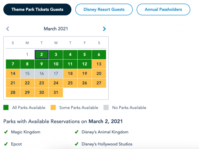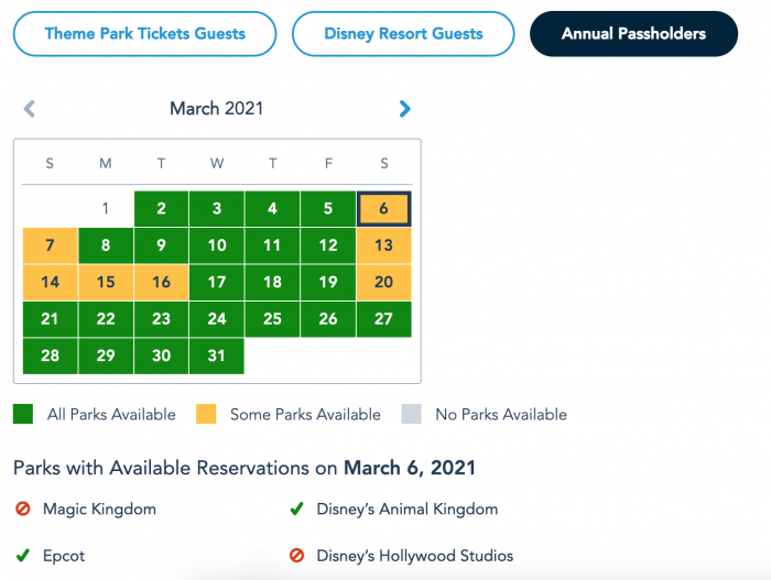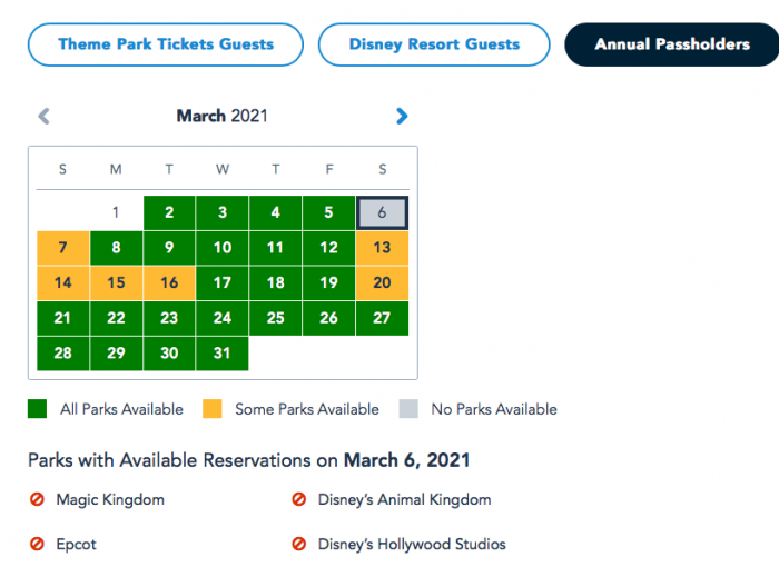 Overall, many dates in March are still available for Annual Passholders to make Park Pass reservations. However, on March 6th, all the parks were fully booked!