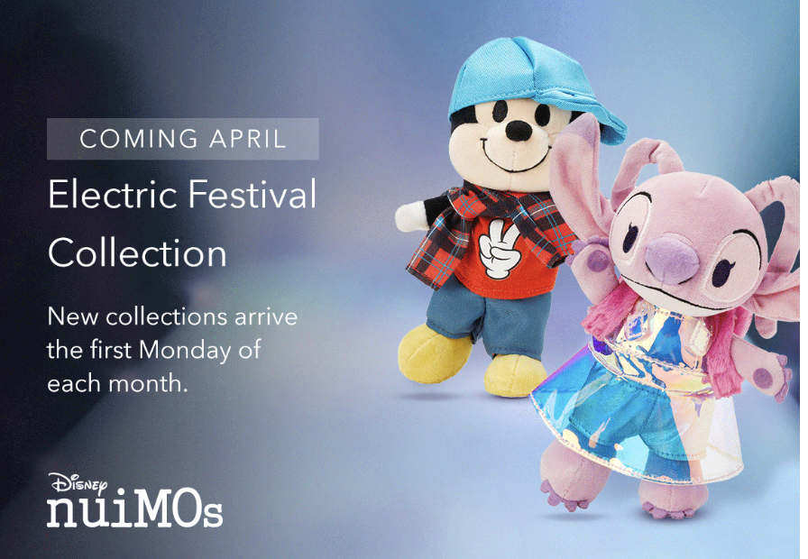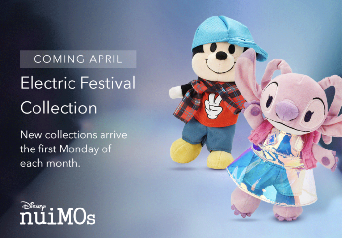 Now, onto a sneak peek at the new styles coming in April! Your Disney nuiMOs will be ready for festival season in the new Electric Festival Collection. Mickey is sporting a new outfit coming next month and Angel is in a shiny dress and vest!