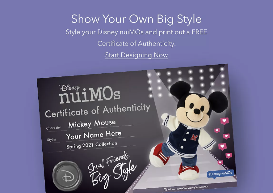 But before we get to the fashion show, we need to talk about a new feature Disney added to all the nuiMOs fun on shopDisney. Now you can become the fashion designer we know you are and certify your nuiMOs looks with an official Certificate of Authenticity. You can select your character plush and an outfit for it on the site! You’ll get a free downloadable certificate and ID card with your look on the runway and even some background music.