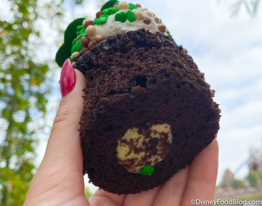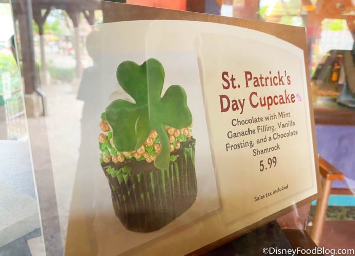 Flame Tree Barbecue at Disney’s Animal Kingdom has a St. Patrick’s Day cupcake! It’s got chocolate cake with mint ganache filling, vanilla frosting, and a white chocolate shamrock.