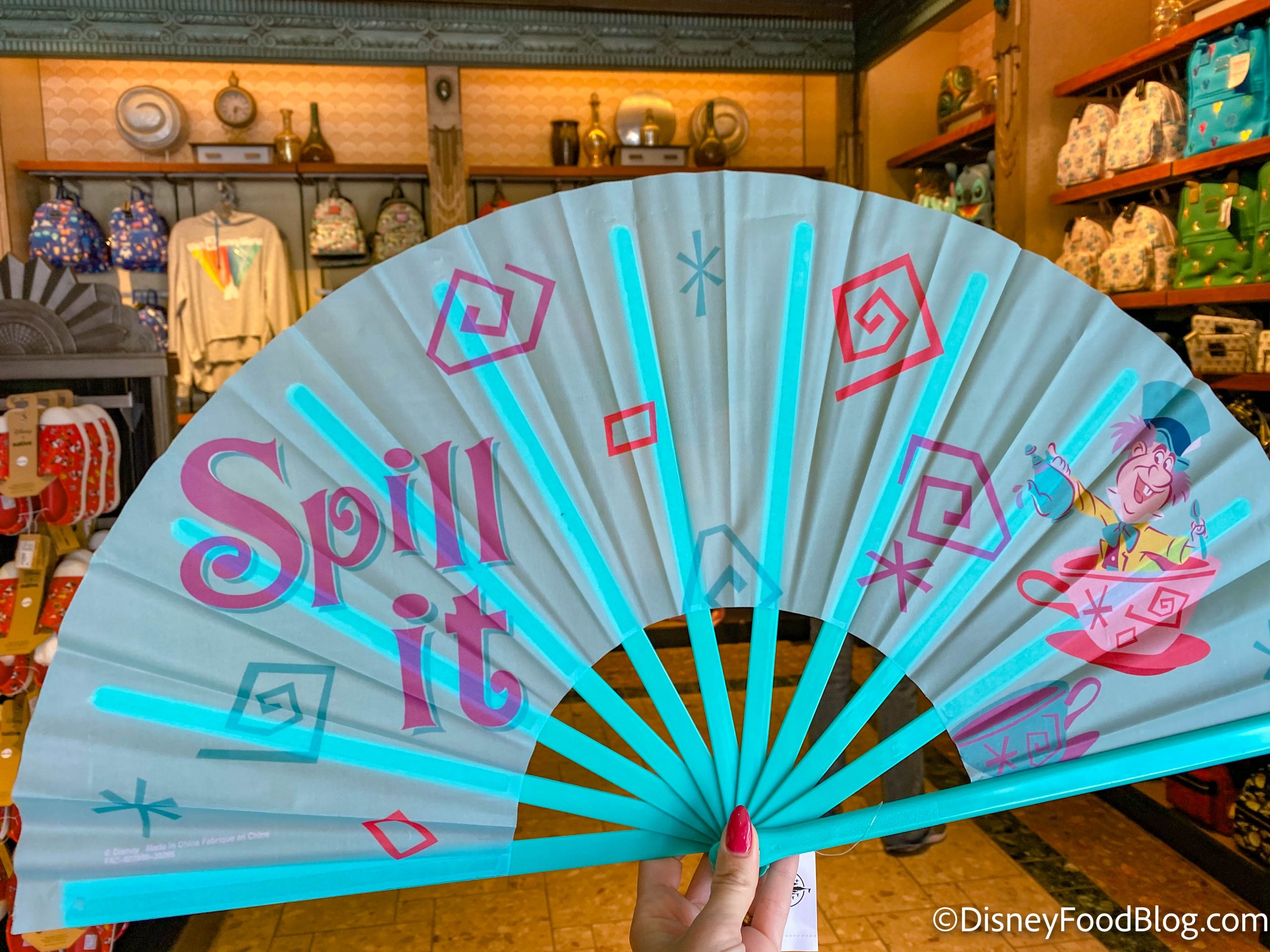 If you’re looking for a way to keep cool in the parks while also being sassy and stylish, then this fan may be just the thing for you! It’s Alice in Wonderland-themed and has the phrase “Spill it” on the design.