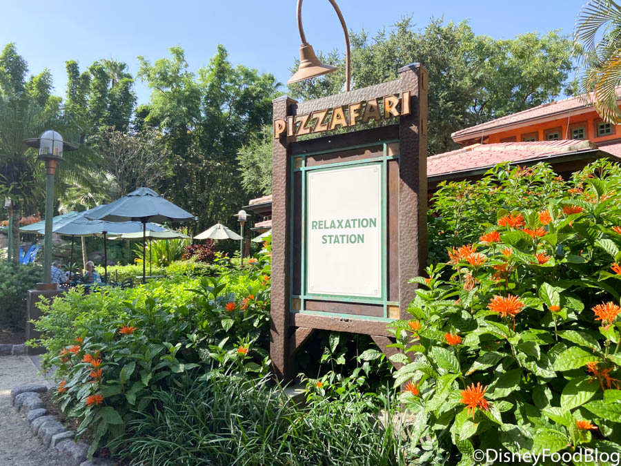 Animal Kingdom has a total of two relaxation stations. The first is close to Pandora: The World of Avatar and the park entrance at Pizzafari! The restaurant has been closed since the parks reopened, so it now serves as an outdoor relaxation station. Guests have access to plenty of shade since each table has its own umbrella!