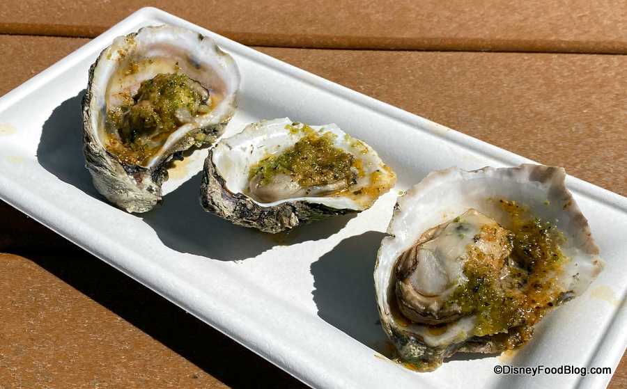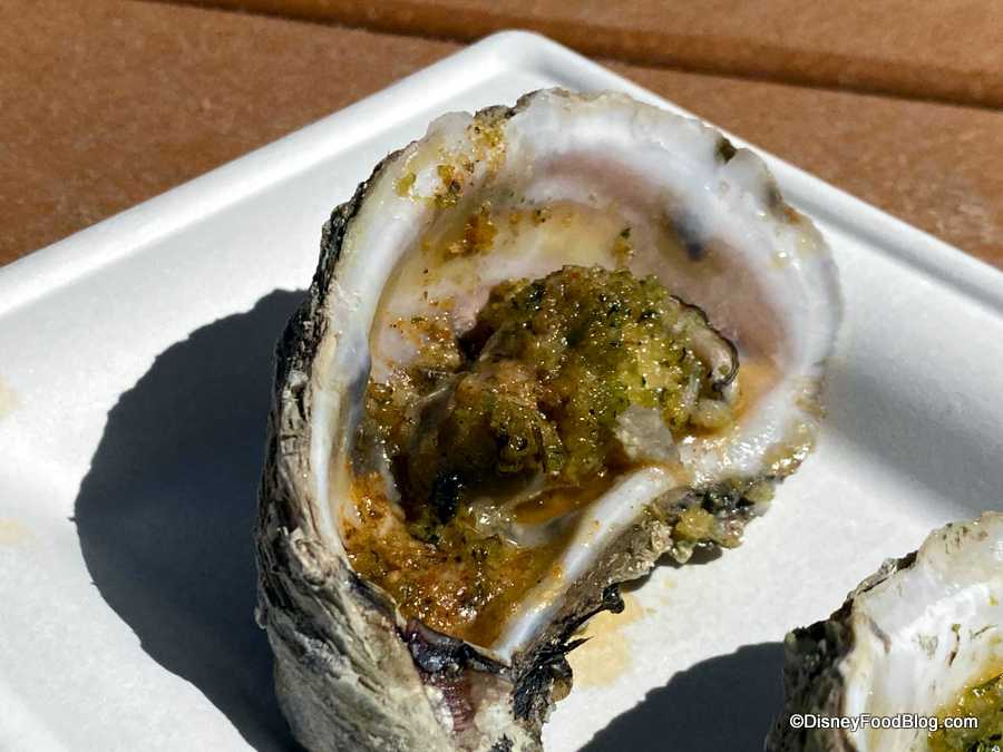 If you’re a fan of oysters, you probably don’t come to EPCOT expecting to be served fresh oysters on the half shell, but here we are! Last year’s Oyster offering here was grilled, but this year is all about Cajun Style ROASTED Oysters for $7.50. We weren’t super wowed with the grilled oysters last year. They were fresh but just not that flavorful.