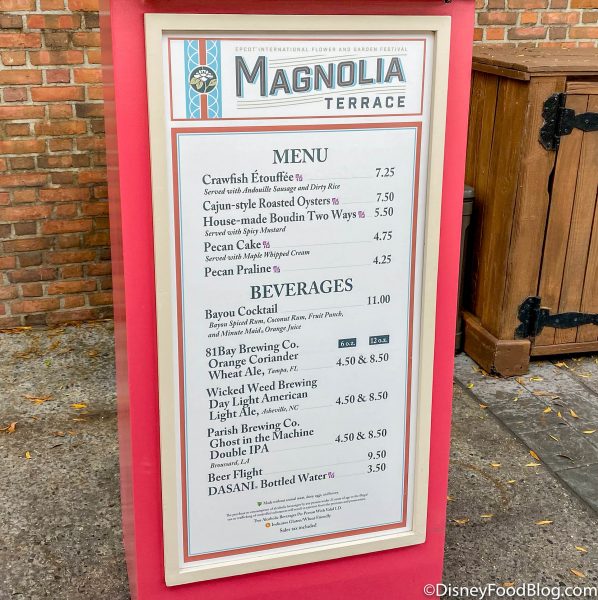 But let’s get back to the food, shall we? Like FOOD is — literally — our middle name! We headed over to Magnolia Terrace, which is celebrating its second year with the festival. This is the official “America” booth of the fest, located in the American Adventure. This booth was…ehh…OK in its debut year last year. A couple hits and a couple of misses. How would it do this year?