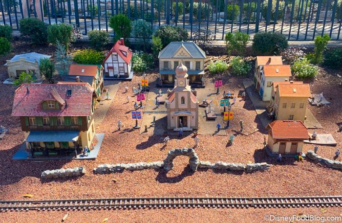 Today, we noticed that a SECOND EPCOT Flower and Garden Fest has kicked-off in EPCOT, but you might need a magnifying glass to see it. If you’ve ever crossed through the Germany Pavilion, you might have noticed a model village with a few trains running through.