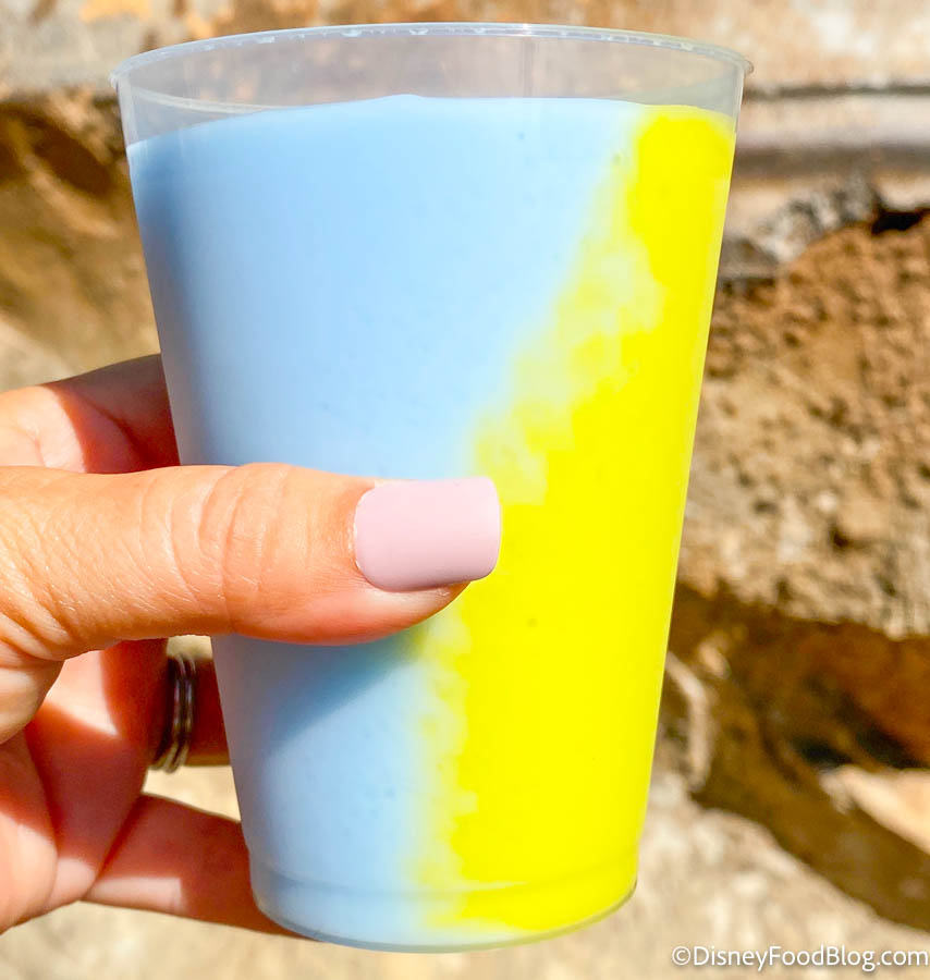 Well, as any devoted snacker would, we opted to get both. And THAT’S when inspiration struck. In a stroke of genius, we asked for a spare cup when the Cast Member handed us our Blue Milk and Green Milk.