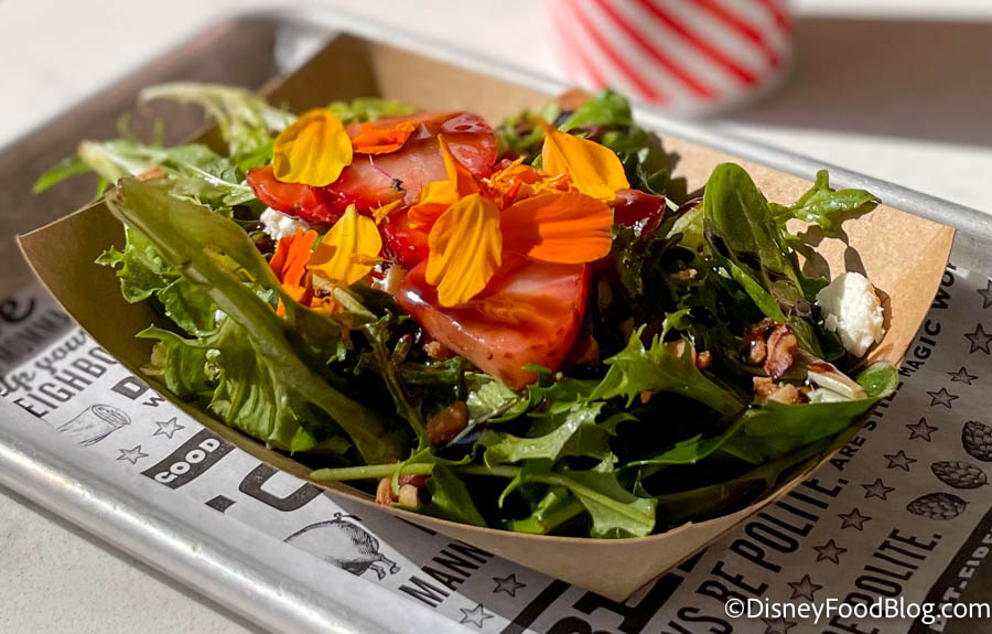 Where is our salad journey taking us to next? The Polite Pig at Disney Springs! We ordered the Florida Strawberry Salad. The salad is made with organic field greens, strawberries, feta, granola, sorghum dressing, and garnished with edible magnolia petals. You can order this decadent salad as a side for $6 or full for $13. We played it safe and got the side portion to make sure we weren’t overdoing it with the whole “health food” thing.